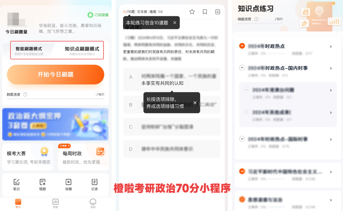 背诵期间要完成对应章节的选择题。我是跟着橙啦的600题小程序(搜索橙啦考研政治70分就能找到)来练习的。