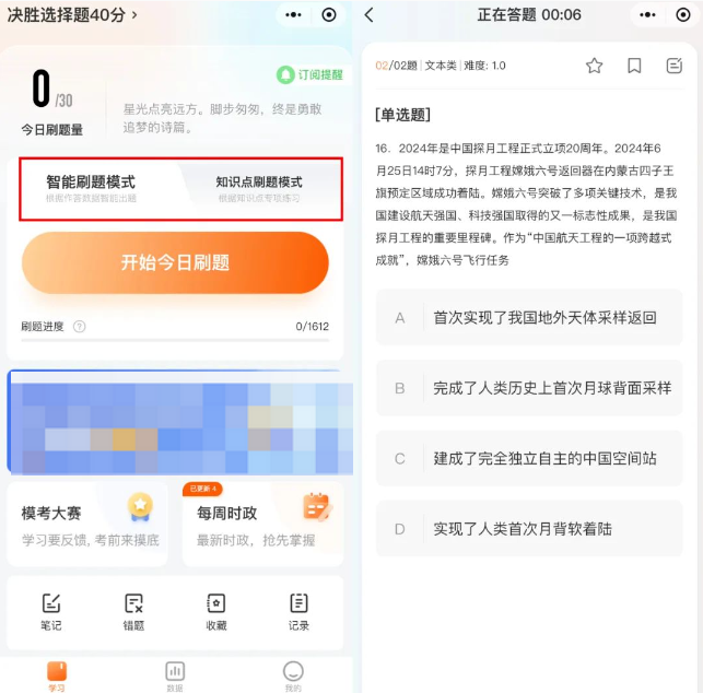 还有!还有!考前政治刷题很重要!!!我是跟着橙啦的600题小程序(搜索橙啦考研政治70分就能找到)刷题。它有两种模式,一种是智能刷题,可以根据作答数据智能出题;另外一种是知识点刷题,可以根据知识点做专项练习。大家可以根据实际情况选择适合自己的模式。