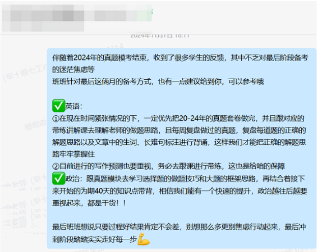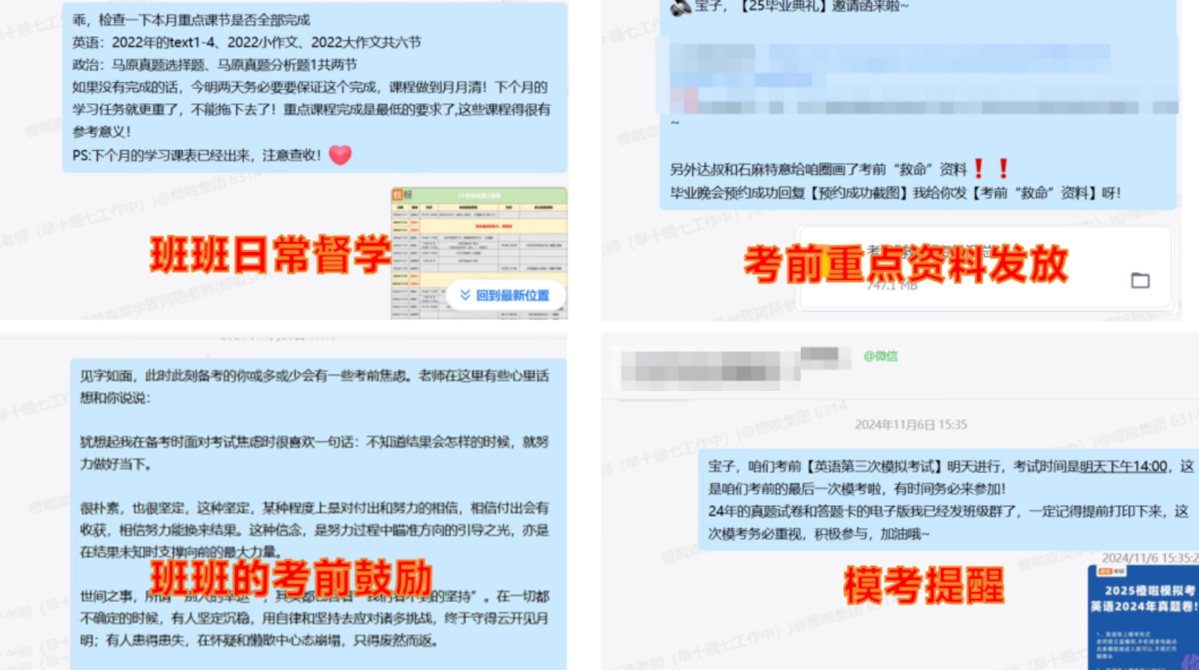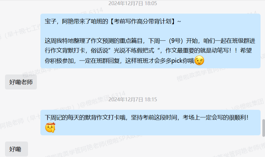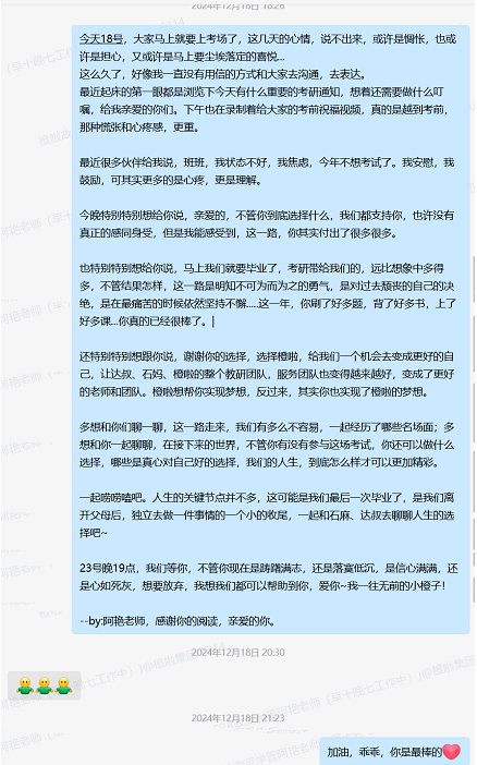 二战时,我加入了橙啦的学习社群,与一群志同道合的研友一起努力,大家互相监督、互相鼓励,学习氛围浓厚了许多。同时我的班主任也会定期督学、提醒我模考、给我考前鼓励,真的很感谢我的班班。