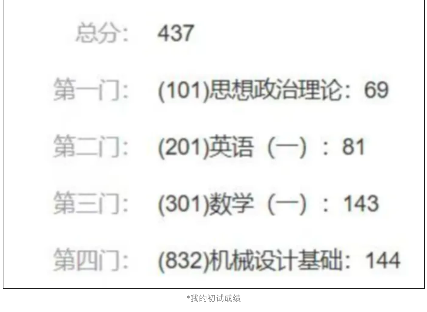 我的初试成绩是437分,其中政治69分、英语(一)81分、数学(一)143分、机械设计基础144分。
