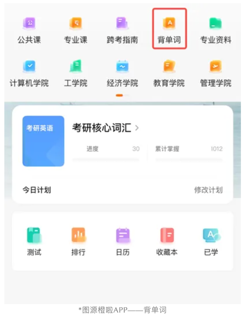 橙啦APP里还能添加考研相关的词汇书电子版,边学单词边测试+收集错题,目标感更强了,方向也更加清晰了。
