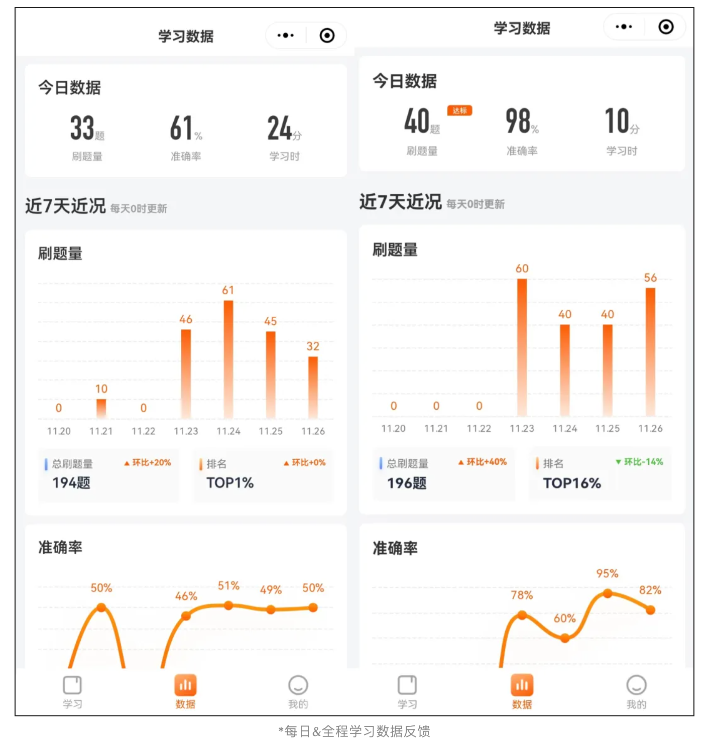 小程序的数据界面会即时反馈学员每日刷题量、准确率、排名以及错题分析。