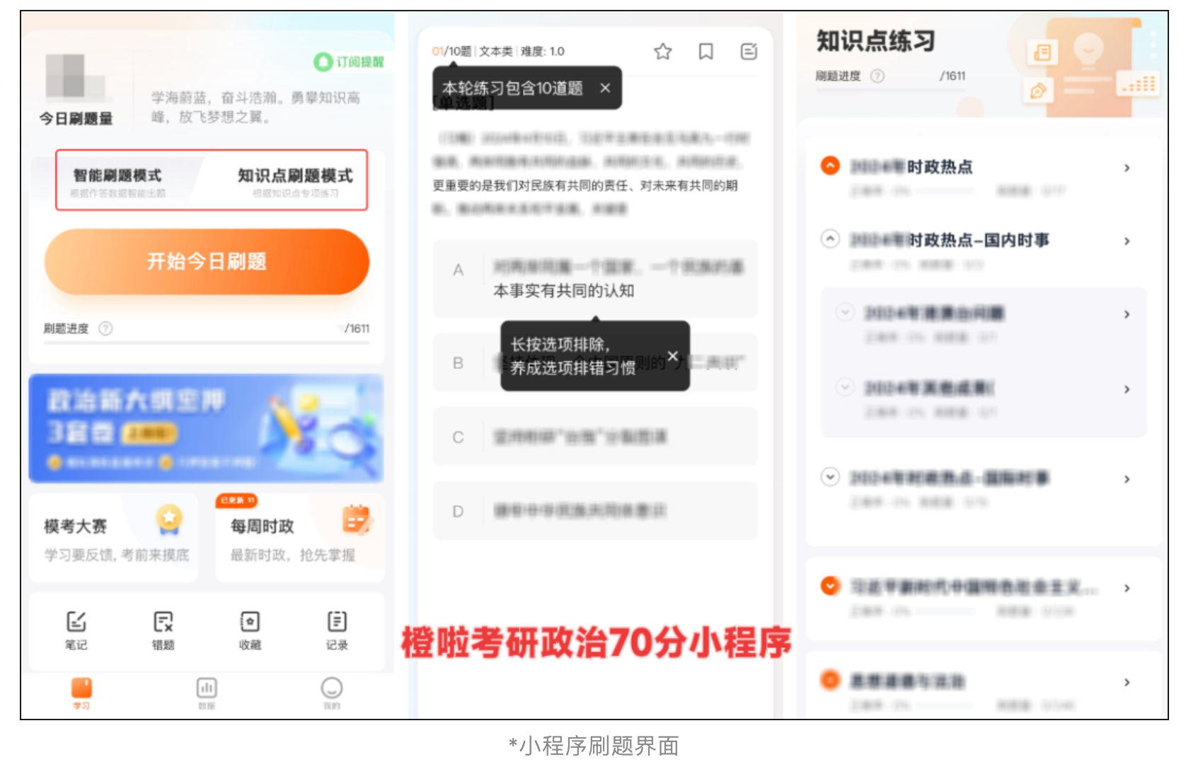 政治备考,选择题是必须拿分项,而选择题的提高,刷题是重中之重!我是跟着橙啦的600题小程序(搜索橙啦考研政治70分就能找到)来练习的。