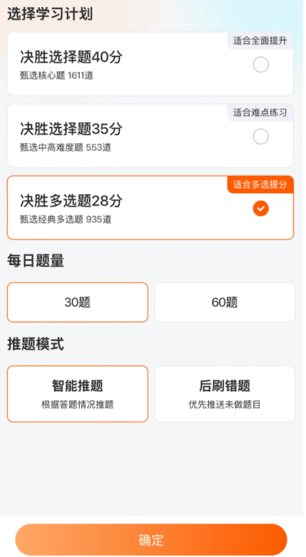 在小程序中,可以选择智能刷题计划,或者根据知识点来刷题;还可以专门刷错题,每天仅需半小时,刷透30个左右选择题,达到的效果远远超过“求快、求多、盲目刷题n小时”。